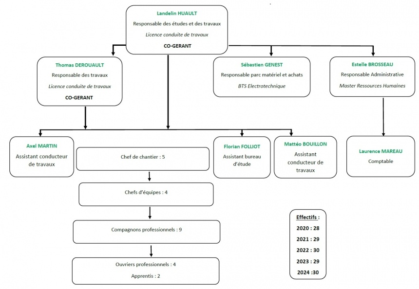 La pérennité du savoir-faire est assurée par Landelin Huault, Co-gérant et responsable des études, Thomas Derouault, Co-gérant et responsable conduite de travaux et Sébastien Genest, responsable du parc matériel et des achats.